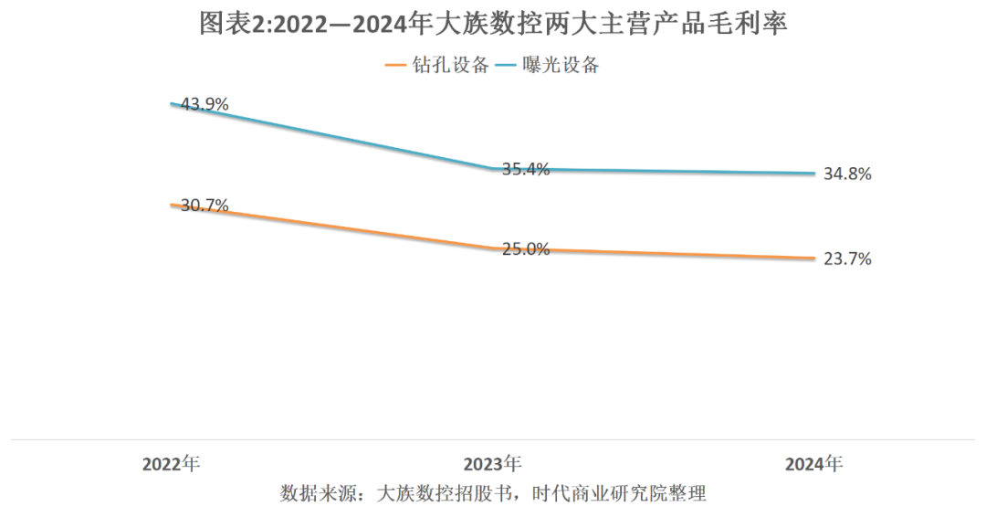 大族数控在招股书中称,2023年钻孔设备毛利率下降,主要是因为市场竞争加剧及需求减少,导致其采取具有竞争力的定价策略,加上其自动化钻孔设备的销售比例增加,但是仍未形成规模经济,制造成本较高;2024年,除了自动化钻孔设备销售增加,为了提高市场渗透率,该公司还下调钻孔设备的平均售价,导致毛利率进一步下降。另外,曝光设备毛利率下降,主要也是受到市场竞争加剧及需求减少,该公司采取有竞争力的定价策略导致的。