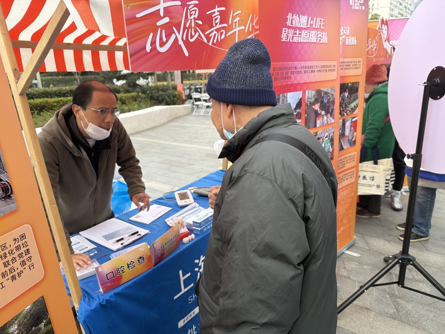 仪式环节结束后,广场变身成为充满活力的志愿服务集市。便民服务摊位前,志愿者们为居民修理小家电、清洗眼镜;健康服务摊位前,不少老年人来测量血压、体验中医耳穴;专业咨询摊位前,志愿者们以互动游戏形式向居民科普反诈、禁毒、消防安全知识。